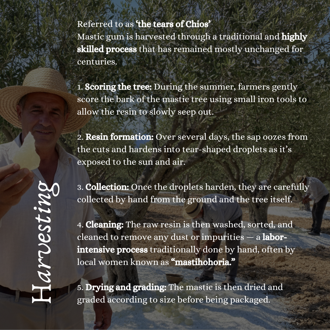 For thousands of years, Mastic Gum has been treasured as a natural remedy and sacred ingredient. Once worth its weight in gold, it is still hand-collected and sun-dried using traditional methods passed down through generations.